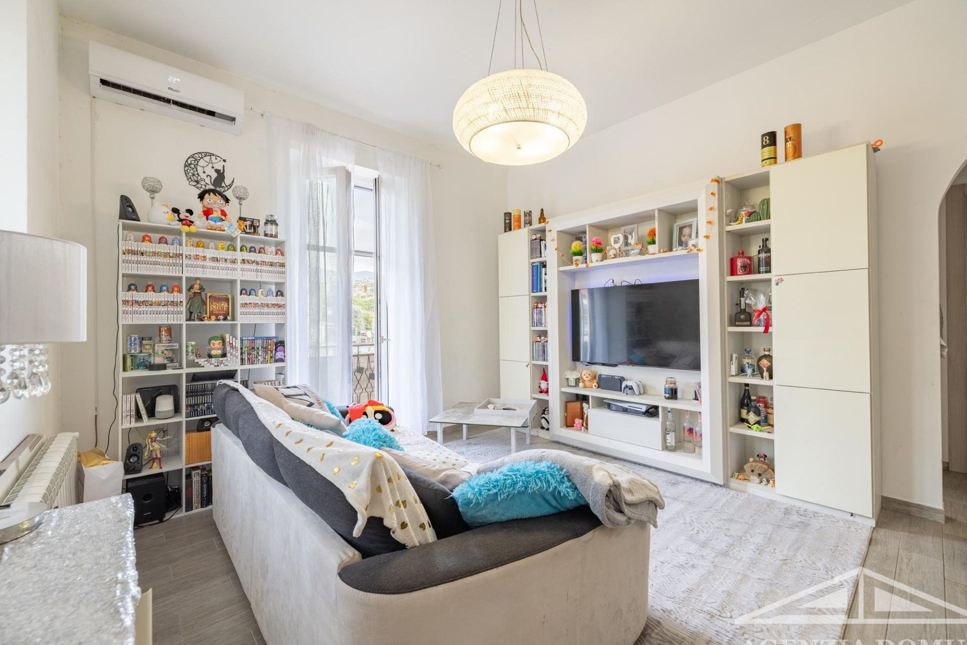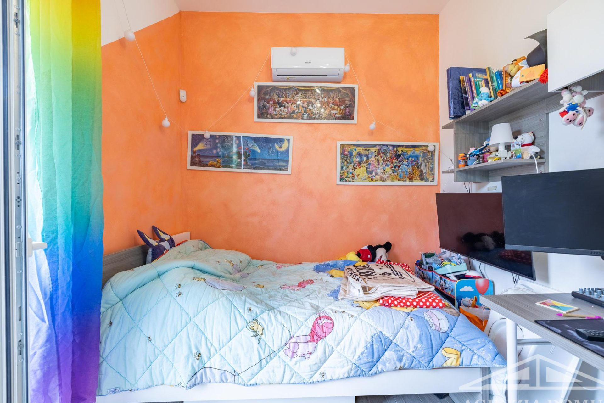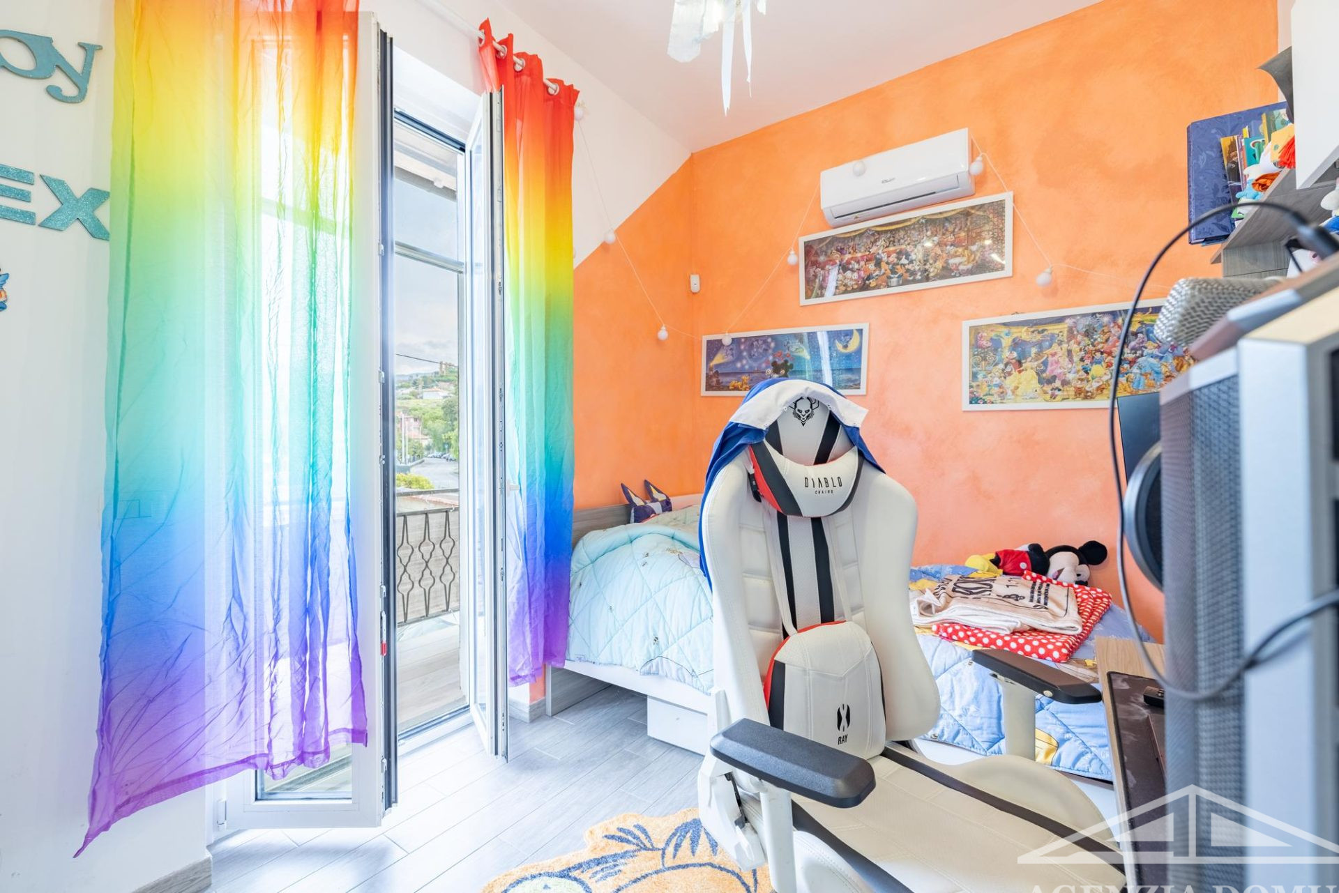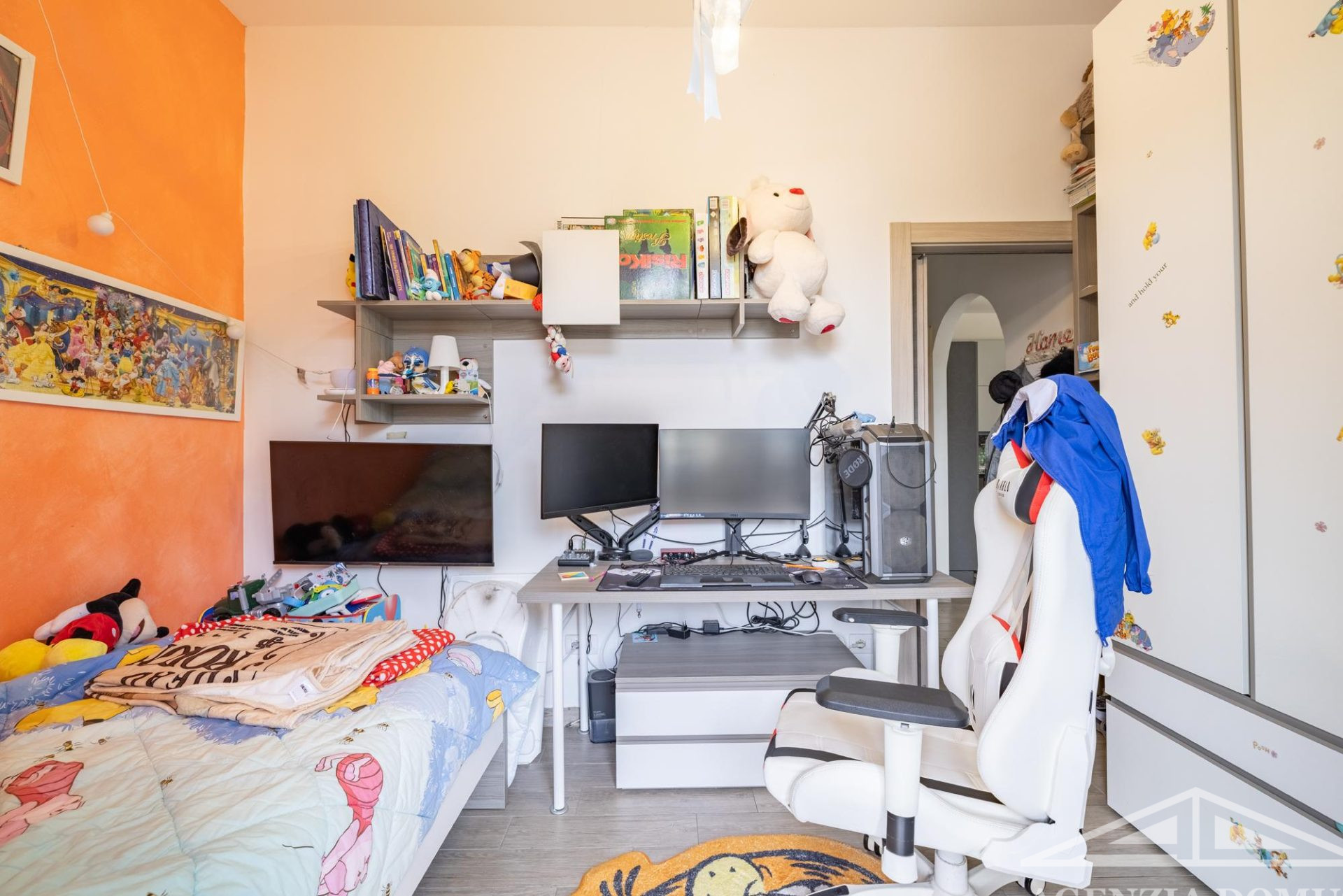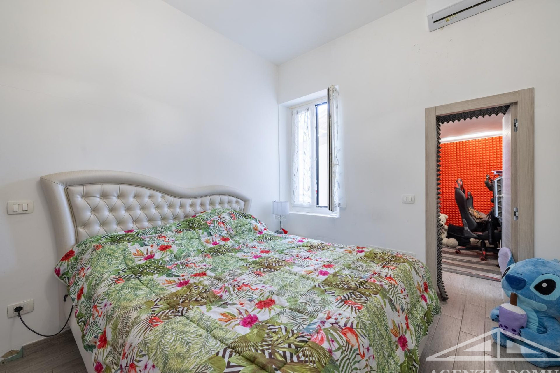 L’alloggio si compone di ingresso nell'area giorno, dotata di soggiorno con angolo cottura, da cui si accede all’ampia terrazza, camera da letto matrimoniale finestrata, cameretta con accesso al balcone, piccolo studio e bagno con doccia.