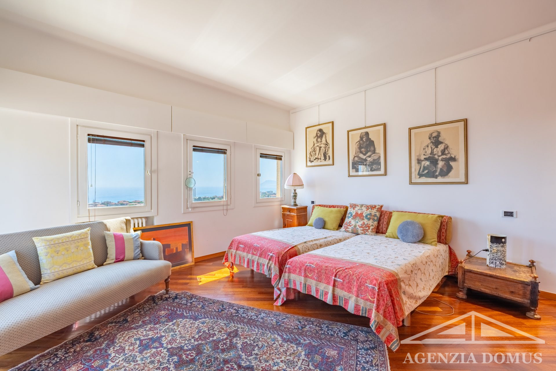 The upper floor hosts three additional bedrooms with large wardrobes and two bathrooms with showers. A panoramic terrace overlooking the town and the sea completes the sleeping area.