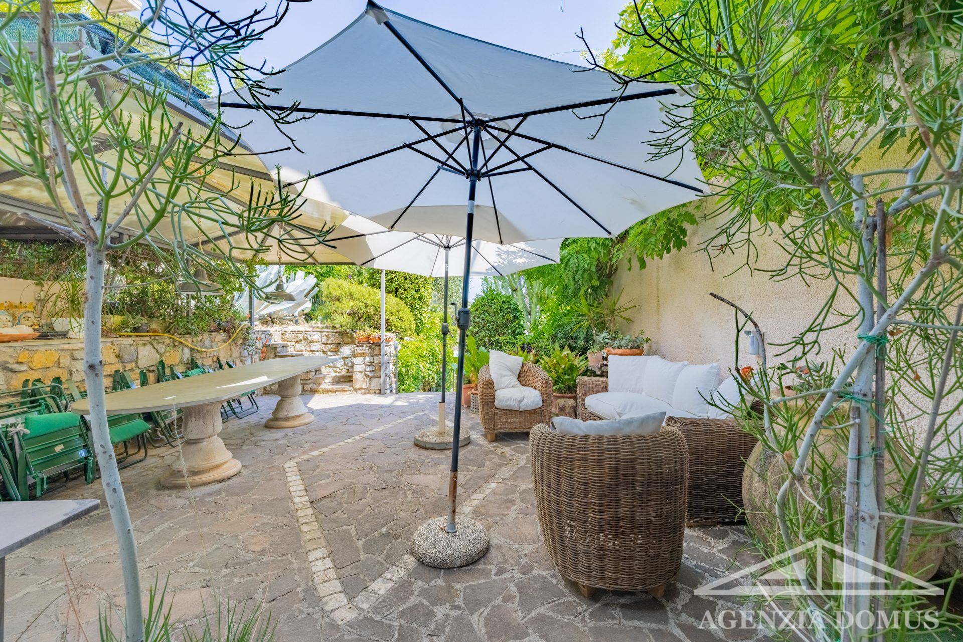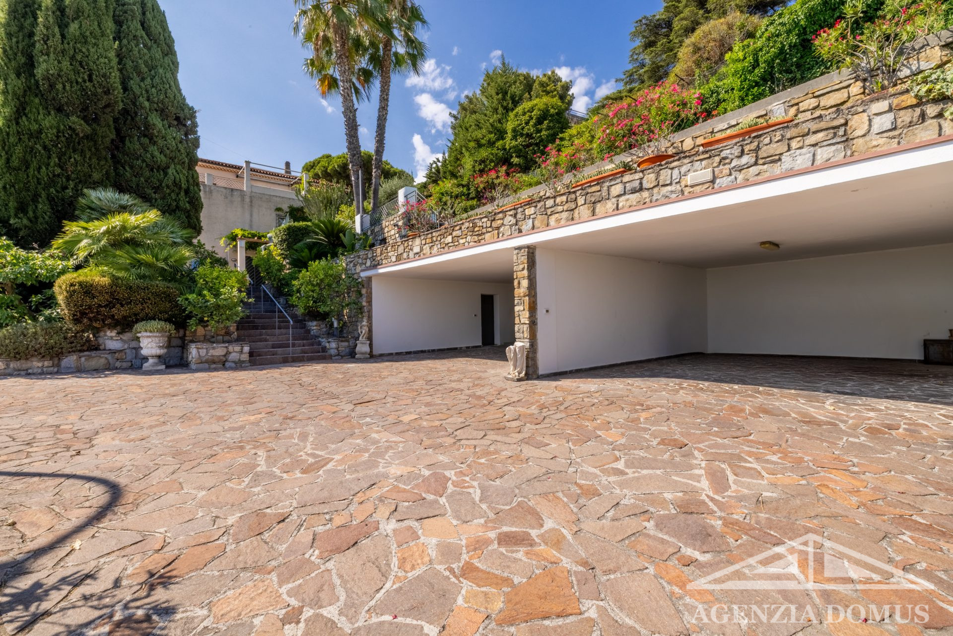 The property is set within an exclusive natural setting, where typical Mediterranean vegetation blends harmoniously with palm trees and local plants, within a lush private garden of 1,300 sqm.