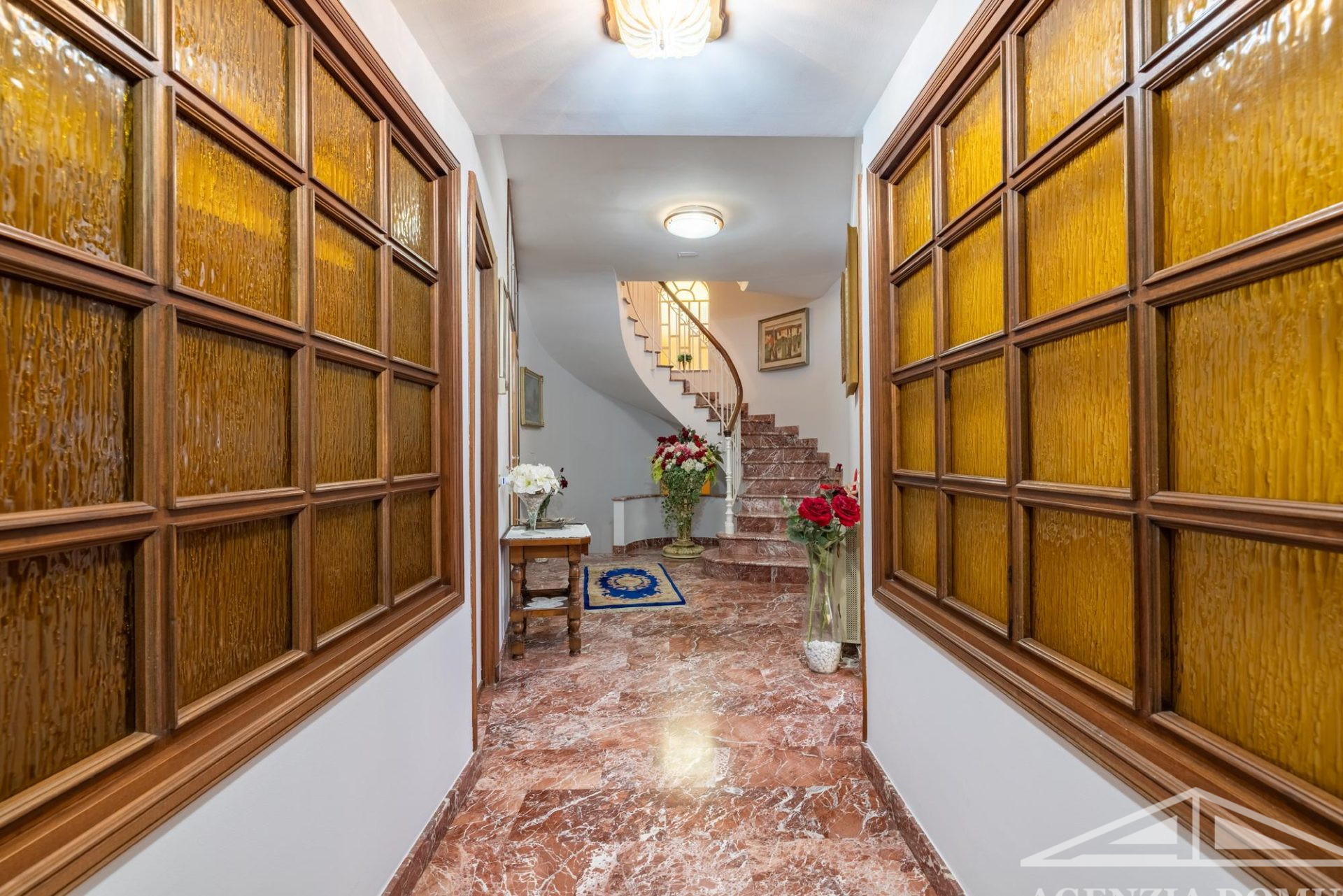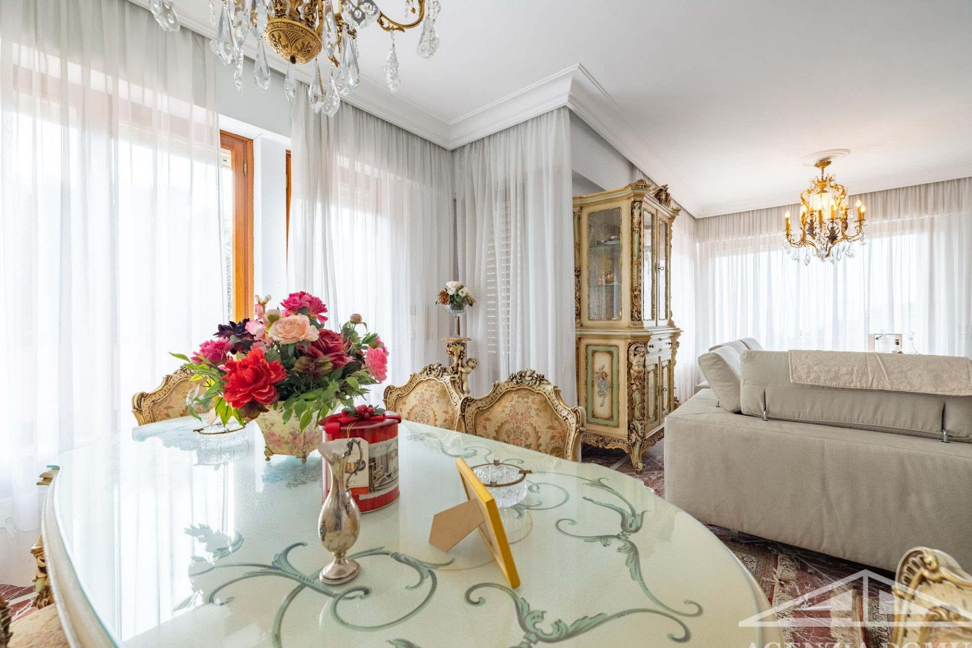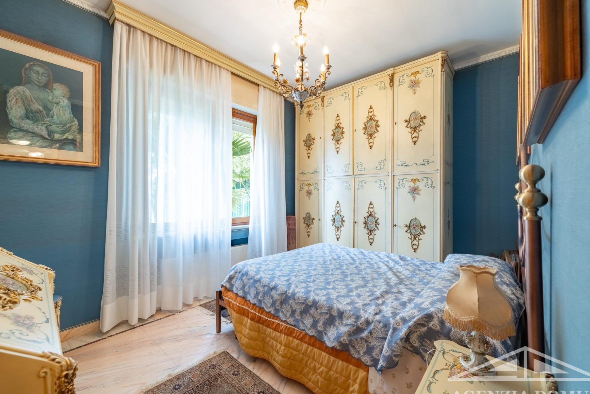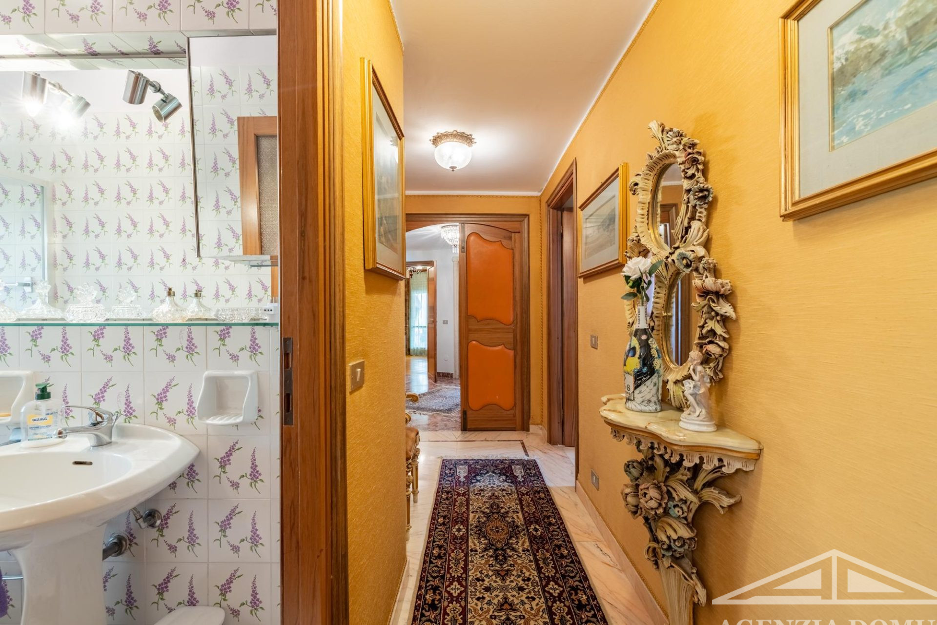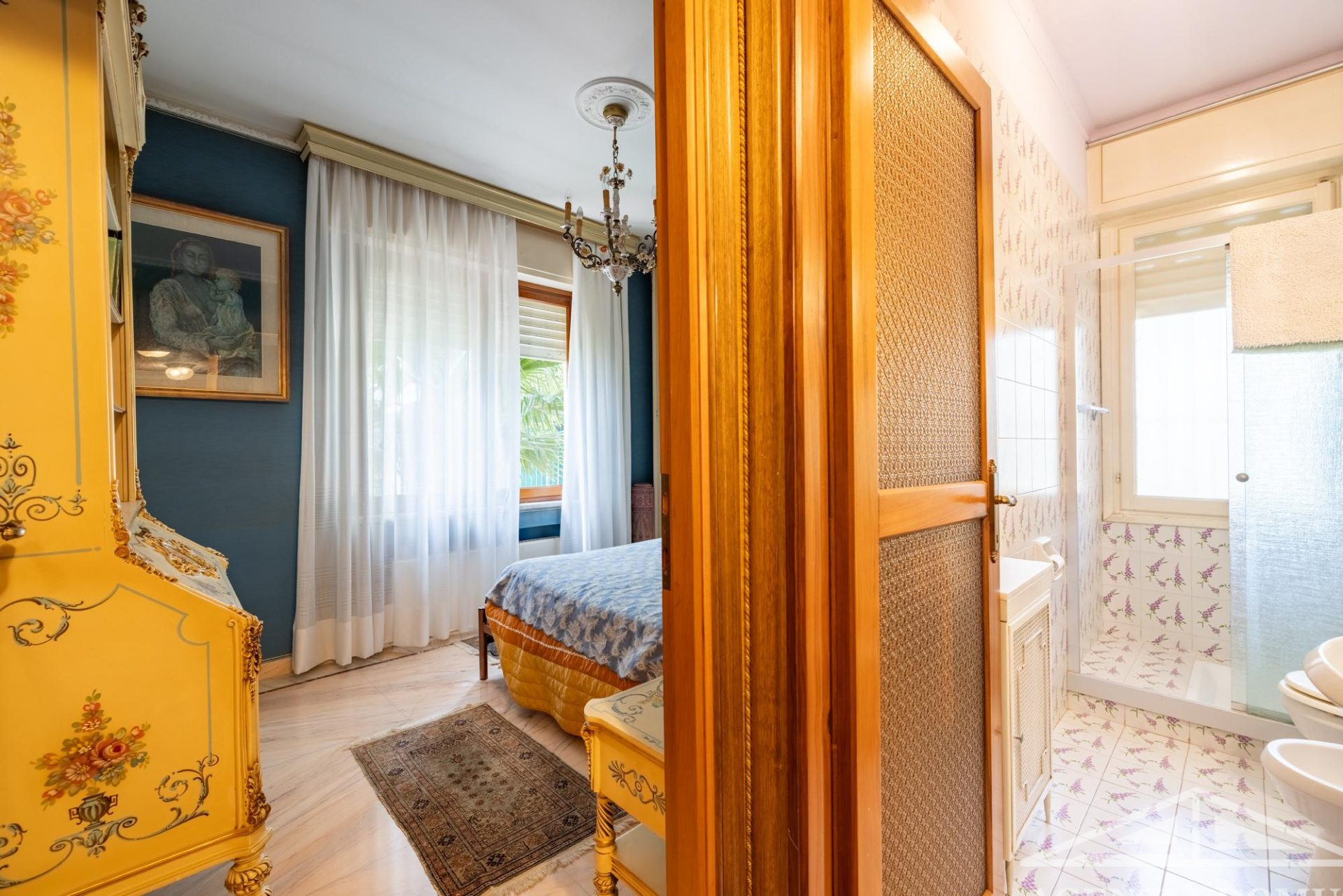 Gli ambienti risultano particolarmente curati e impreziositi da raffinati dettagli in passamaneria, eleganti carte da parati, marmi pregiati e piastrelle decorate a mano, elementi che donano alla casa uno stile elegante e ricercato.