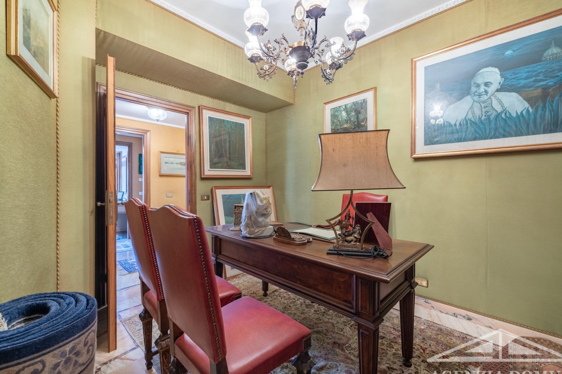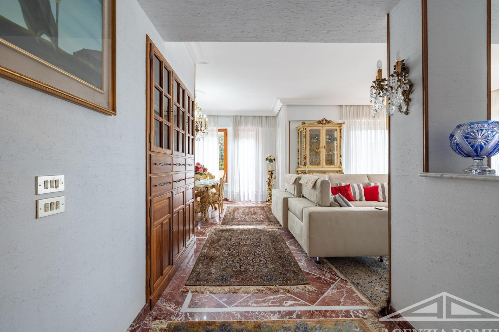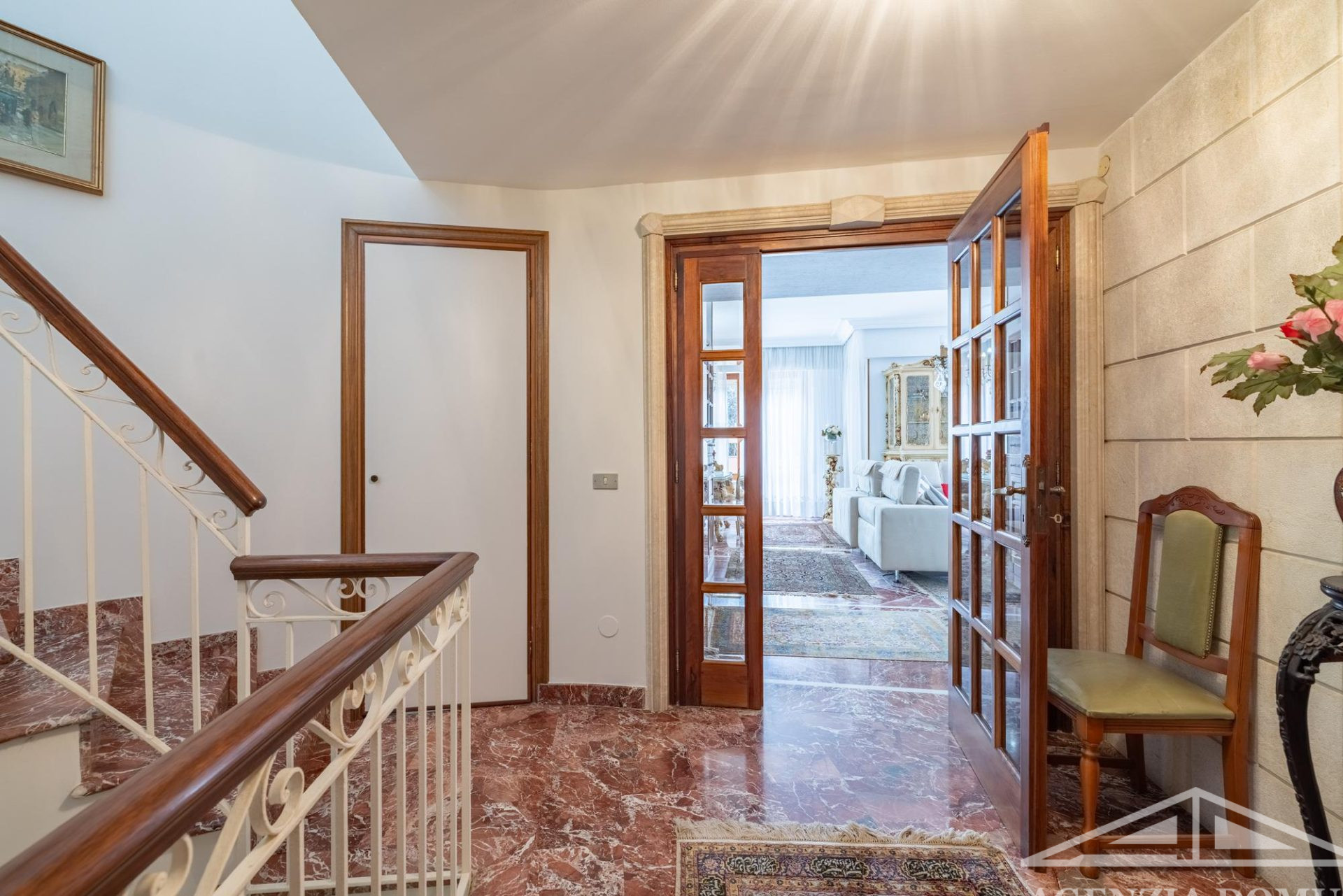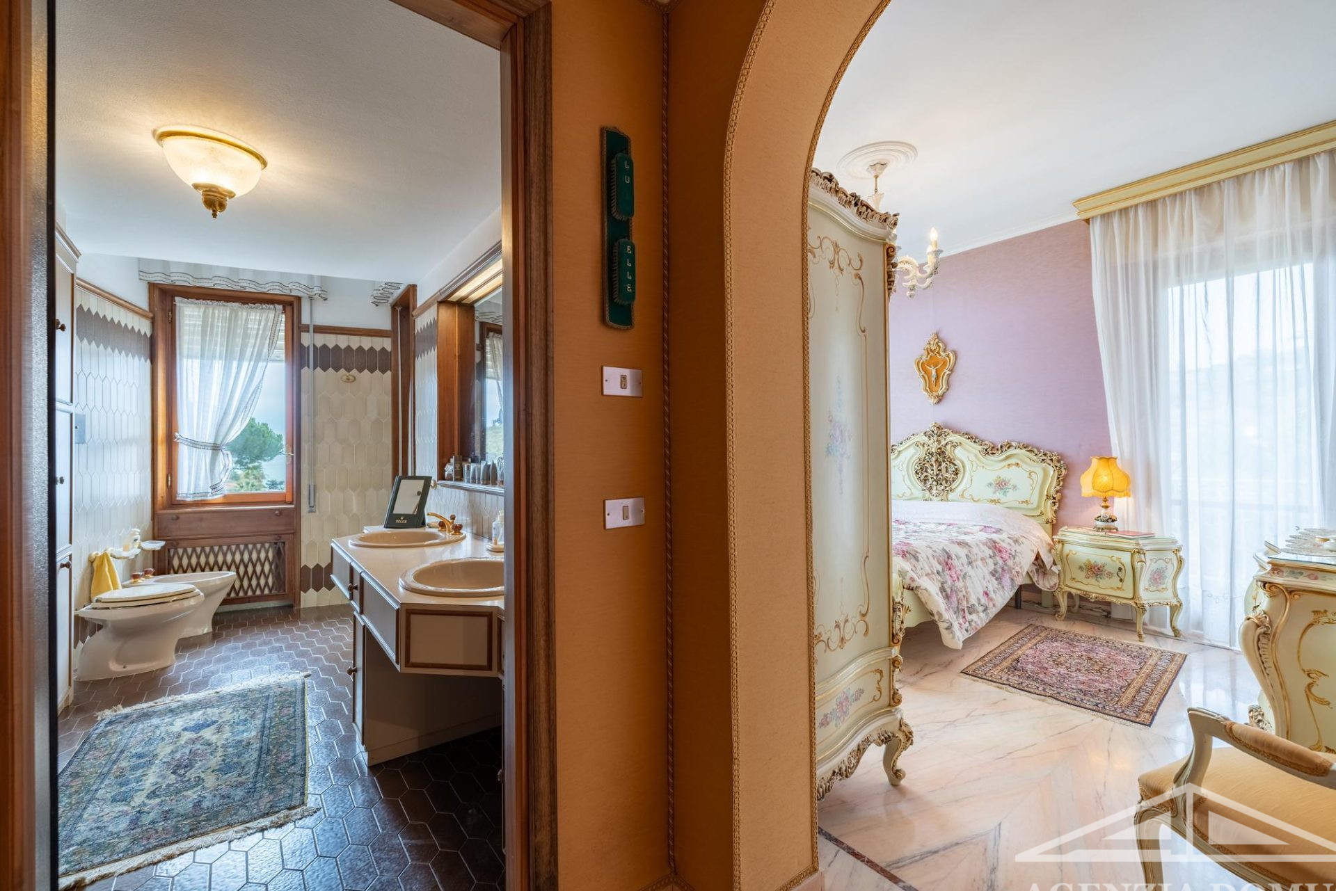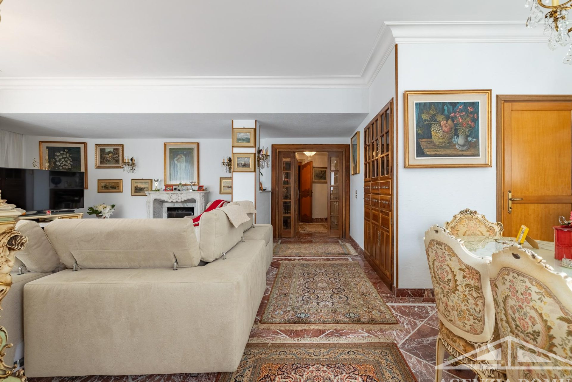 Gli ambienti risultano particolarmente curati e impreziositi da raffinati dettagli in passamaneria, eleganti carte da parati, marmi pregiati e piastrelle decorate a mano, elementi che donano alla casa uno stile elegante e ricercato.