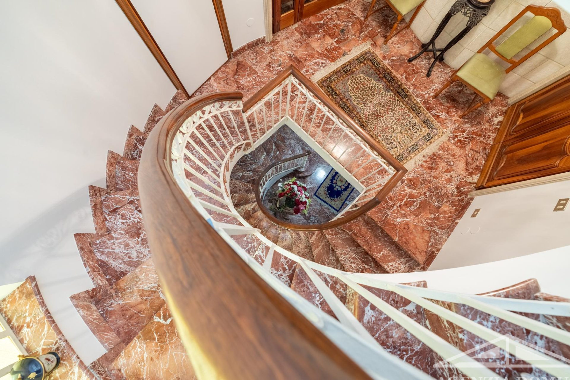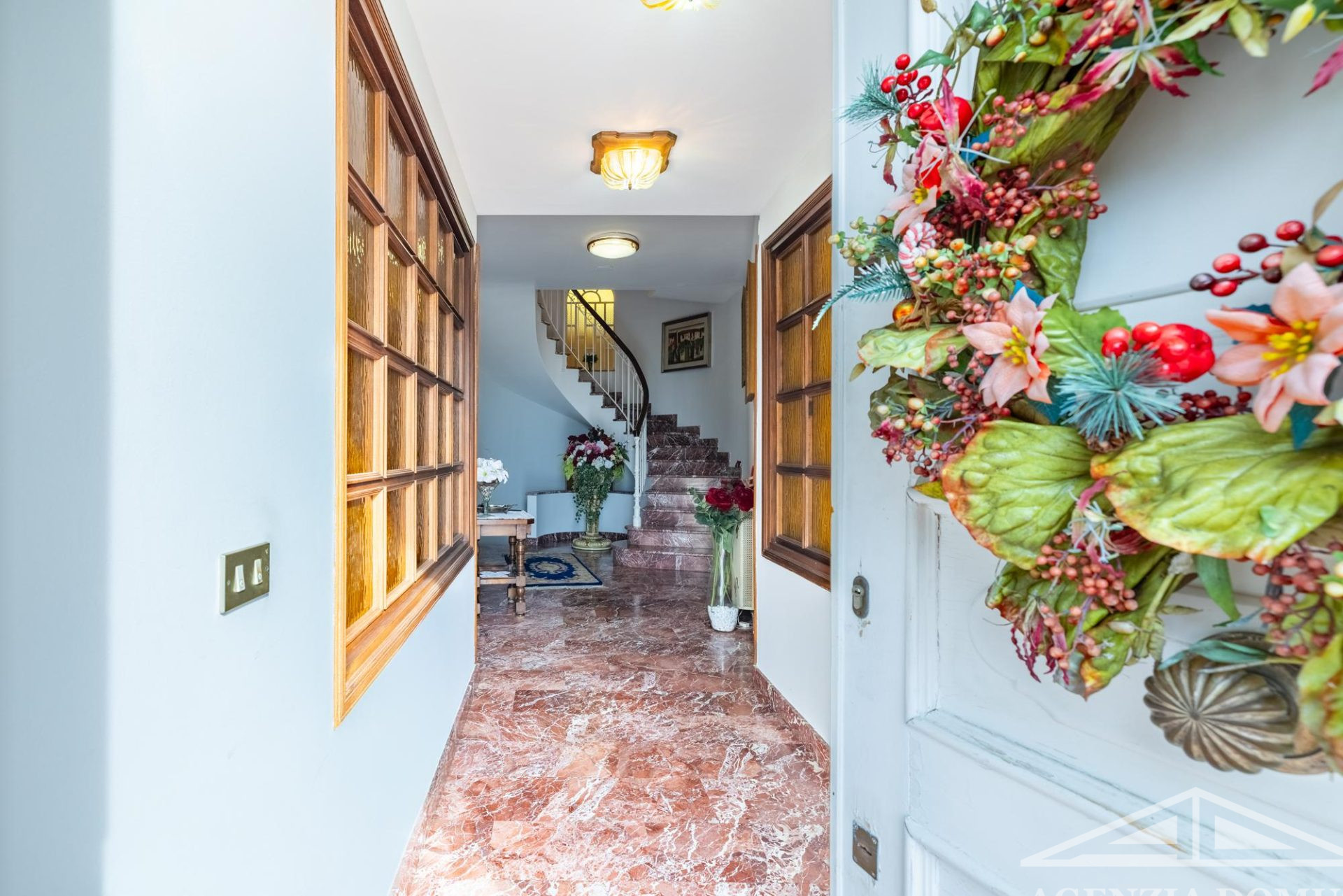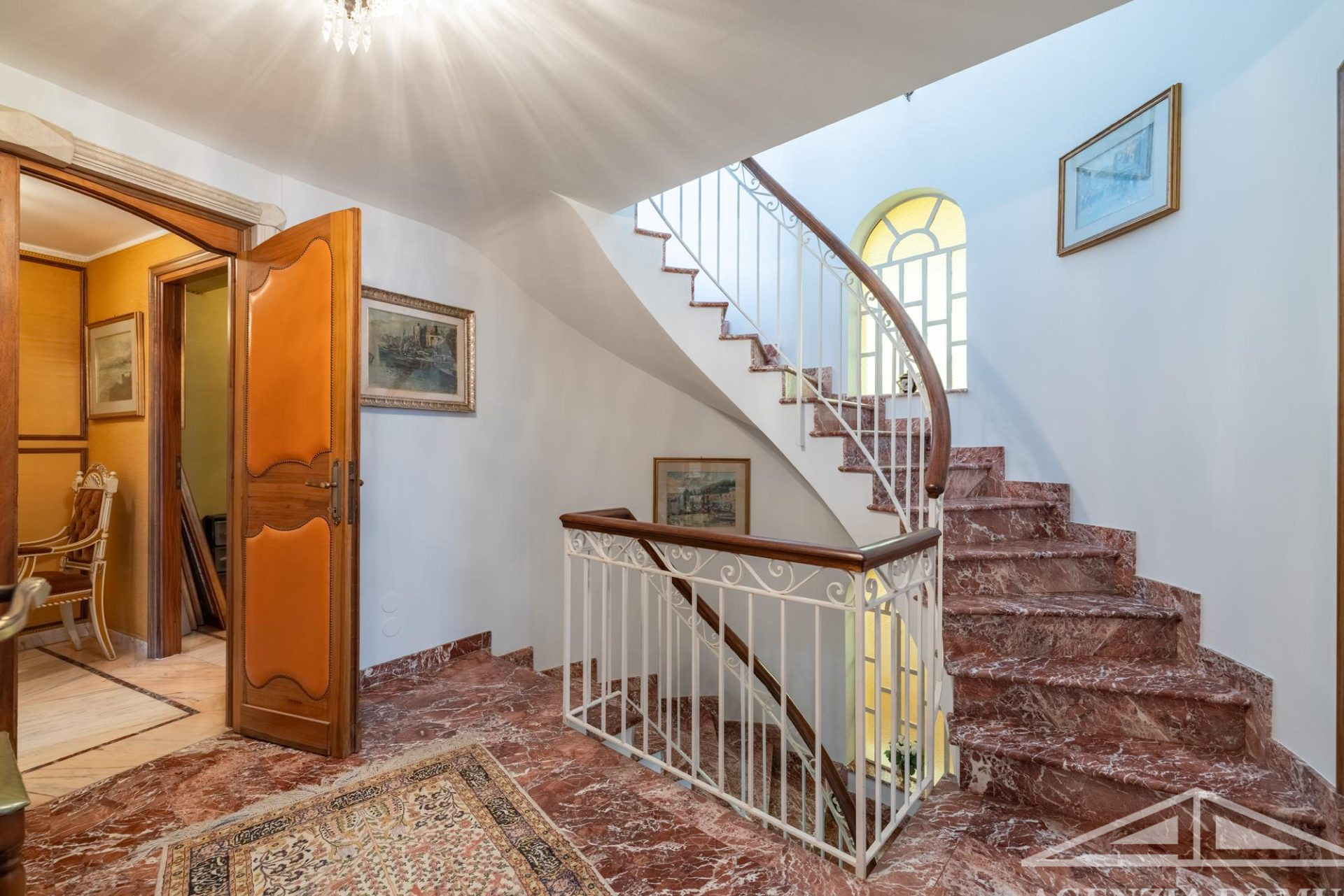 L’ingresso e la scala principale, che collegano i vari livelli, sono anch’essi realizzati su misura in pregiato marmo rosa, elemento di grande valore e forte impatto scenografico.