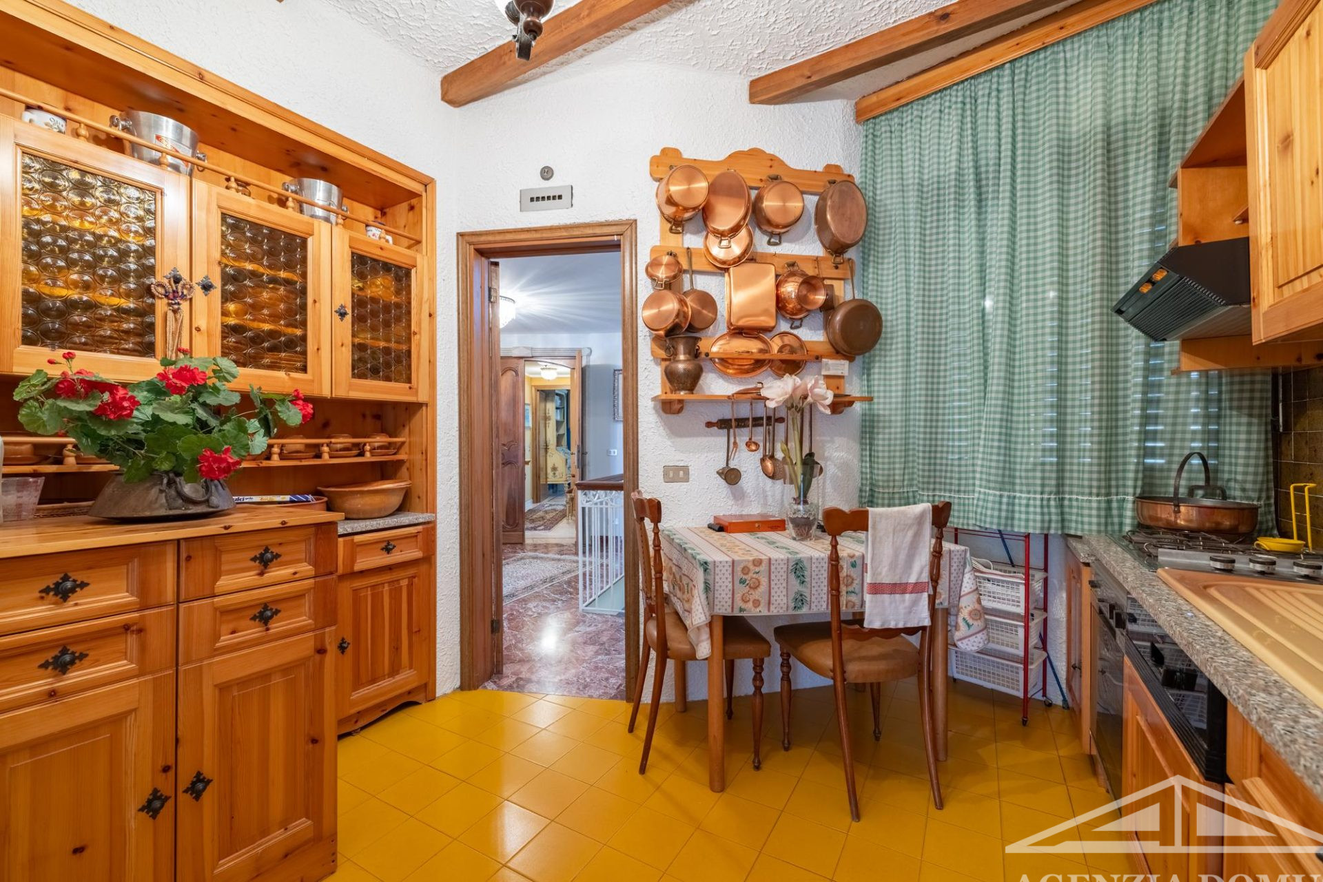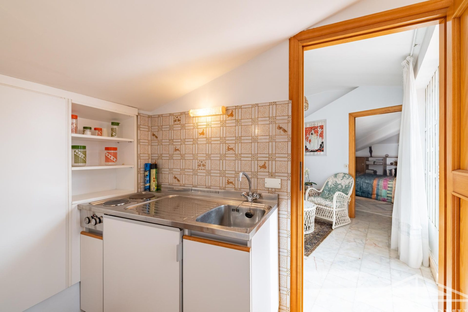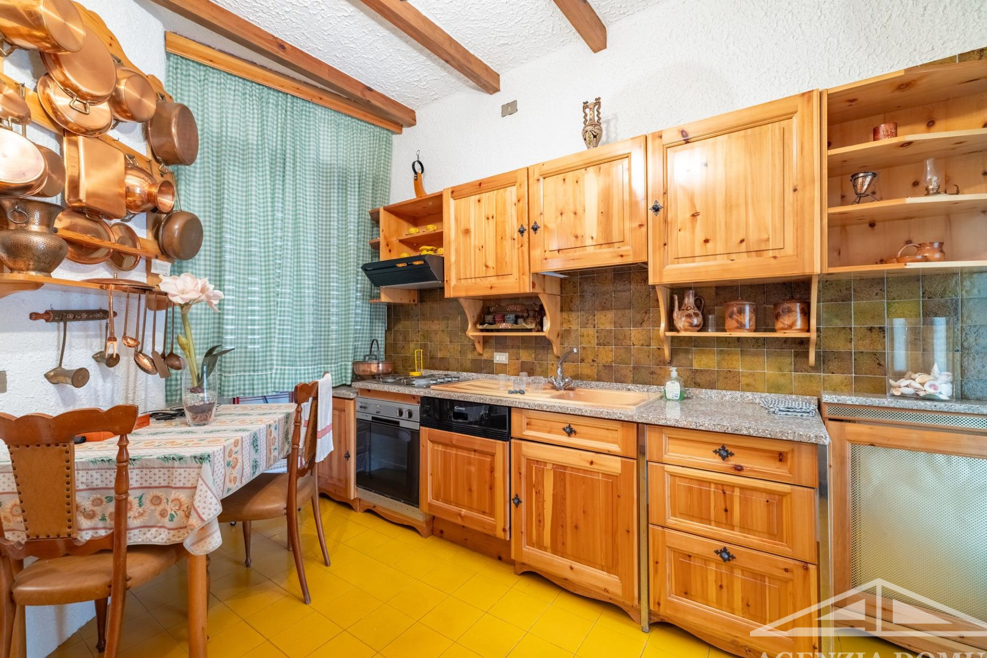 L’arredo dell’abitazione è interamente su misura e, per la maggior parte, in legno, con mobili realizzati artigianalmente e dipinti a mano.