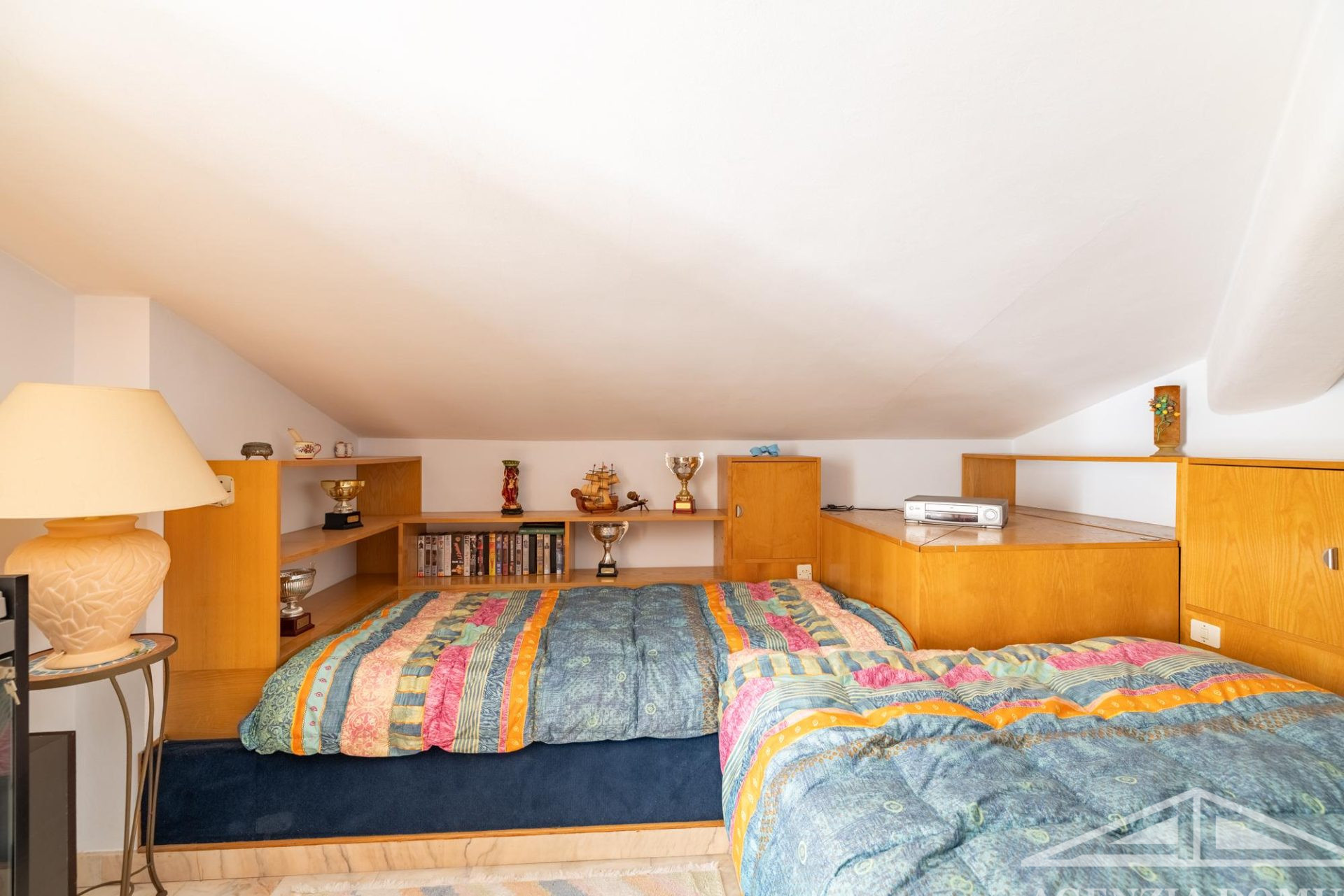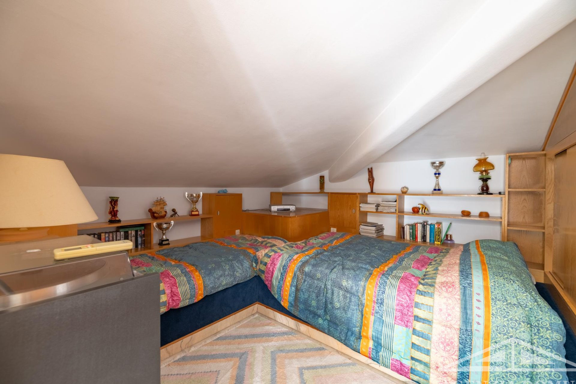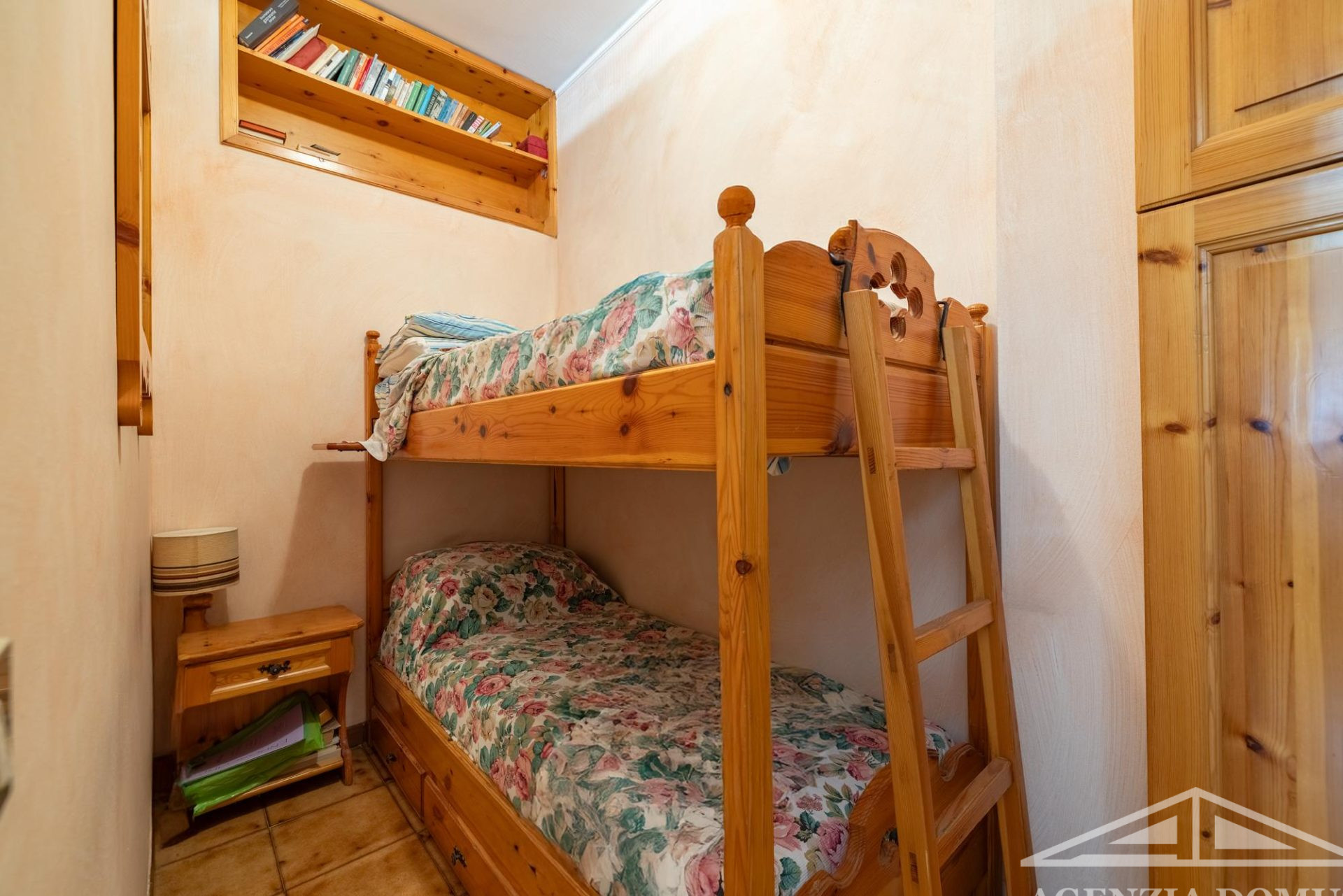 L’arredo dell’abitazione è interamente su misura e, per la maggior parte, in legno, con mobili realizzati artigianalmente e dipinti a mano.