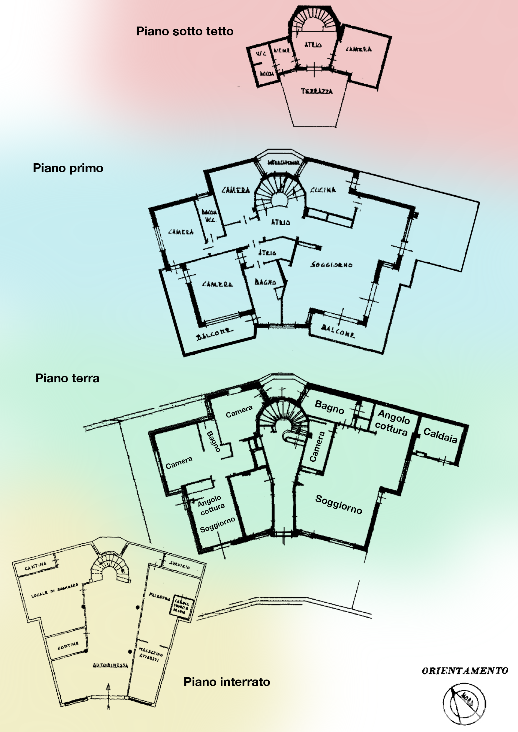 Il piano interrato ospita numerosi locali accessori, tra cui autorimessa, un’area palestra con doccia e sauna, locali di sgombero e cantina.